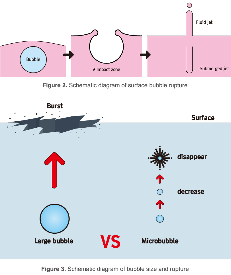 During cell culture, various mechanical actions contribute to shear stress, such as collisions, gas flow, interactions with gas bubbles, and foaming. The diagram below illustrates the rupture of air bubbles on the surface3,4.