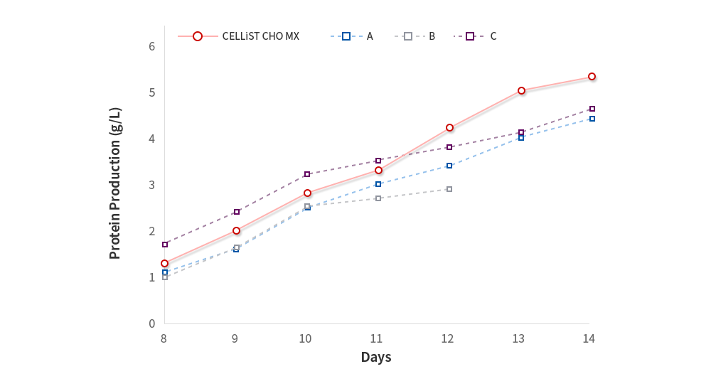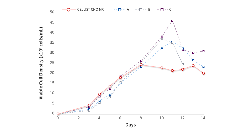 Below are cell culture performance results for CELLiST BASAL CHO MX Medium and several other commer- cially-available media. The fed-batch process was performed using ambr15.