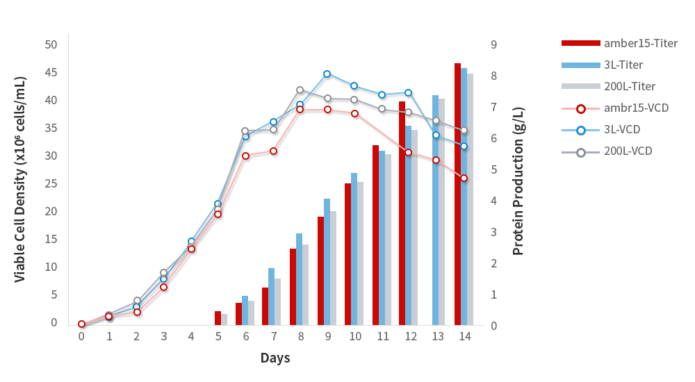 Figure 3. Viable cell density and IgG titer profiles. 3 kinds of bioreactor were used, which are ambr15, 3L bench-top reactor, and 200L bioreactor.